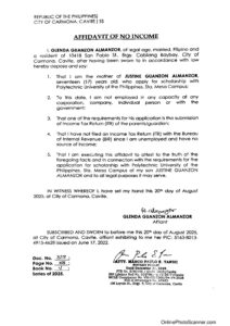 Upload a PDF File of the latest Bureau of Internal Revenue Income Tax Return (ITR) of your parents/guardians or yours, if you’re already working. If you or your parent/guardians do not have an ITR, you may submit a Certificate of Indigence from your Barangay or an Affidavit of Non-filing of Income Tax Return.: Affidavit-of-No-Income