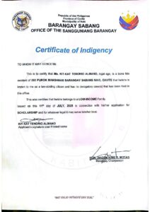 Upload a PDF File of the latest Bureau of Internal Revenue Income Tax Return (ITR) of your parents/guardians or yours, if you’re already working. If you or your parent/guardians do not have an ITR, you may submit a Certificate of Indigence from your Barangay or an Affidavit of Non-filing of Income Tax Return.: Almano-Certificate-of-Indigency