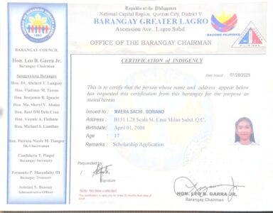 Upload a PDF File of the latest Bureau of Internal Revenue Income Tax Return (ITR) of your parents/guardians or yours, if you’re already working. If you or your parent/guardians do not have an ITR, you may submit a Certificate of Indigence from your Barangay or an Affidavit of Non-filing of Income Tax Return.: BARANGAY-COUNCIL-1