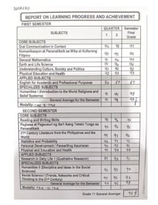 Upload a PDF File Containing Your Grade Records as Described in the Requirements Above. Your most recent report cards or grades must have a cumulative Grade Point Average (GPA) on it.: card-of-Sheine-Bucacao
