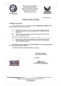 Upload a PDF File of the latest Bureau of Internal Revenue Income Tax Return (ITR) of your parents/guardians or yours, if you’re already working. If you or your parent/guardians do not have an ITR, you may submit a Certificate of Indigence from your Barangay or an Affidavit of Non-filing of Income Tax Return.: Cert-of-Tax-Exemption-Father
