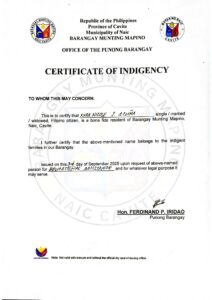Upload a PDF File of the latest Bureau of Internal Revenue Income Tax Return (ITR) of your parents/guardians or yours, if you’re already working. If you or your parent/guardians do not have an ITR, you may submit a Certificate of Indigence from your Barangay or an Affidavit of Non-filing of Income Tax Return.: Certificate-Of-Indigency-ACUNA-X.N