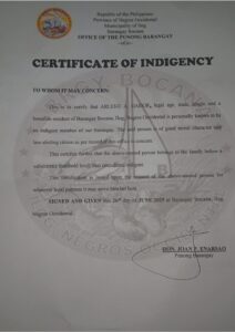 Upload a PDF File of the latest Bureau of Internal Revenue Income Tax Return (ITR) of your parents/guardians or yours, if you’re already working. If you or your parent/guardians do not have an ITR, you may submit a Certificate of Indigence from your Barangay or an Affidavit of Non-filing of Income Tax Return.: CERTIFICATE-OF-INDIGENCY