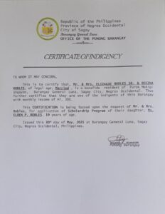 Upload a PDF File of the latest Bureau of Internal Revenue Income Tax Return (ITR) of your parents/guardians or yours, if you’re already working. If you or your parent/guardians do not have an ITR, you may submit a Certificate of Indigence from your Barangay or an Affidavit of Non-filing of Income Tax Return.: CERTIFICATE-OF-INDIGENCY