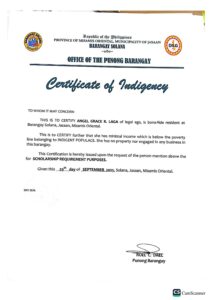 Upload a PDF File of the latest Bureau of Internal Revenue Income Tax Return (ITR) of your parents/guardians or yours, if you’re already working. If you or your parent/guardians do not have an ITR, you may submit a Certificate of Indigence from your Barangay or an Affidavit of Non-filing of Income Tax Return.: CERTIFICATE-OF-INDIGENCY