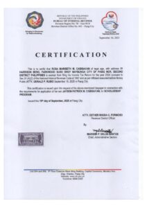 Upload a PDF File of the latest Bureau of Internal Revenue Income Tax Return (ITR) of your parents/guardians or yours, if you’re already working. If you or your parent/guardians do not have an ITR, you may submit a Certificate of Indigence from your Barangay or an Affidavit of Non-filing of Income Tax Return.: CERTIFICATION-Cabigayan-001