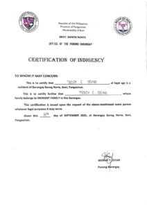 Upload a PDF File of the latest Bureau of Internal Revenue Income Tax Return (ITR) of your parents/guardians or yours, if you’re already working. If you or your parent/guardians do not have an ITR, you may submit a Certificate of Indigence from your Barangay or an Affidavit of Non-filing of Income Tax Return.: Certification-of-Indigency