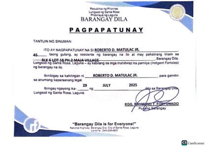 Upload a PDF File of the latest Bureau of Internal Revenue Income Tax Return (ITR) of your parents/guardians or yours, if you’re already working. If you or your parent/guardians do not have an ITR, you may submit a Certificate of Indigence from your Barangay or an Affidavit of Non-filing of Income Tax Return.: Cristine-Matulacs-Parents-Certificate-of-Indigence
