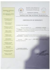 Upload a PDF File of the latest Bureau of Internal Revenue Income Tax Return (ITR) of your parents/guardians or yours, if you’re already working. If you or your parent/guardians do not have an ITR, you may submit a Certificate of Indigence from your Barangay or an Affidavit of Non-filing of Income Tax Return.: DASIGANALEXANDERG-INDIGENCY