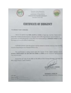 Upload a PDF File of the latest Bureau of Internal Revenue Income Tax Return (ITR) of your parents/guardians or yours, if you’re already working. If you or your parent/guardians do not have an ITR, you may submit a Certificate of Indigence from your Barangay or an Affidavit of Non-filing of Income Tax Return.: indigency