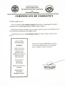 Upload a PDF File of the latest Bureau of Internal Revenue Income Tax Return (ITR) of your parents/guardians or yours, if you’re already working. If you or your parent/guardians do not have an ITR, you may submit a Certificate of Indigence from your Barangay or an Affidavit of Non-filing of Income Tax Return.: indigency
