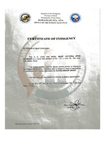Upload a PDF File of the latest Bureau of Internal Revenue Income Tax Return (ITR) of your parents/guardians or yours, if you’re already working. If you or your parent/guardians do not have an ITR, you may submit a Certificate of Indigence from your Barangay or an Affidavit of Non-filing of Income Tax Return.: INDIGENCY_APURADO-MARY-VICTORIA-A