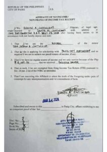 Upload a PDF File of the latest Bureau of Internal Revenue Income Tax Return (ITR) of your parents/guardians or yours, if you’re already working. If you or your parent/guardians do not have an ITR, you may submit a Certificate of Indigence from your Barangay or an Affidavit of Non-filing of Income Tax Return.: Justiniano_Affidavit-of-Non-filing-of-Income-Tax-Return