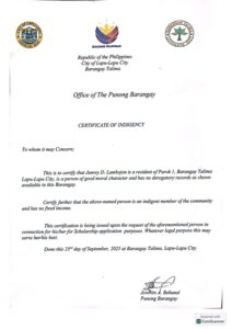 Upload a PDF File of the latest Bureau of Internal Revenue Income Tax Return (ITR) of your parents/guardians or yours, if you’re already working. If you or your parent/guardians do not have an ITR, you may submit a Certificate of Indigence from your Barangay or an Affidavit of Non-filing of Income Tax Return.: Lambojon-COI