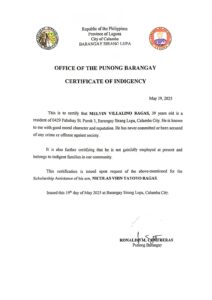 Upload a PDF File of the latest Bureau of Internal Revenue Income Tax Return (ITR) of your parents/guardians or yours, if you’re already working. If you or your parent/guardians do not have an ITR, you may submit a Certificate of Indigence from your Barangay or an Affidavit of Non-filing of Income Tax Return.: RAGAS_Certificate-of-Indigency