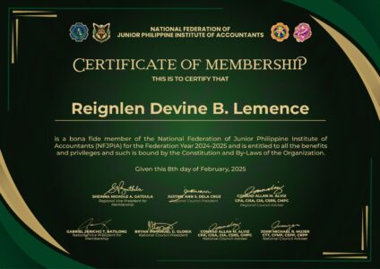 Upload a PDF File of the latest Bureau of Internal Revenue Income Tax Return (ITR) of your parents/guardians or yours, if you’re already working. If you or your parent/guardians do not have an ITR, you may submit a Certificate of Indigence from your Barangay or an Affidavit of Non-filing of Income Tax Return.: Reignlen-Devine-B.-Lemence_Membership-Certificate