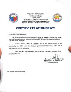 Upload a PDF File of the latest Bureau of Internal Revenue Income Tax Return (ITR) of your parents/guardians or yours, if you’re already working. If you or your parent/guardians do not have an ITR, you may submit a Certificate of Indigence from your Barangay or an Affidavit of Non-filing of Income Tax Return.: Saranza-Reina-M.-indigency